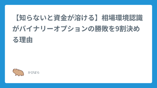トレード手法【知らないと資金が溶ける】相場環境認識がバイナリーオプションの勝敗を9割決める理由 2025年8月22日 かぴばら ハイ&ロー研究所 「よし、ここだ!と思ってエントリーした瞬間に、まるで見ていたかのように価格が逆行…」「なぜか自分がエントリーした時だけ負けてしまう…」「い …