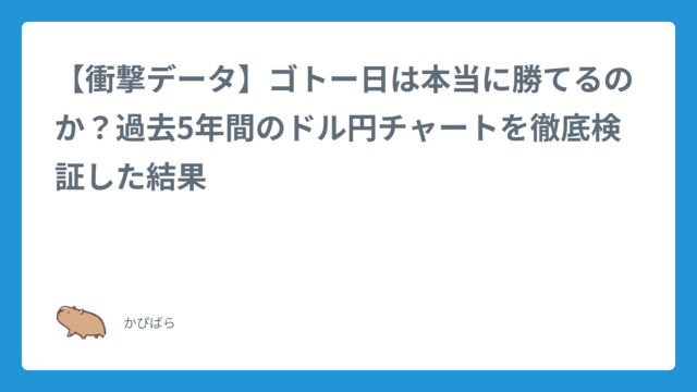 トレード手法【衝撃データ】ゴトー日は本当に勝てるのか?過去5年間のドル円チャートを徹底検証した結果 2025年9月1日 かぴばら ハイ&ロー研究所 「ゴトー日には、ドル円のレートが上がりやすい」バイナリーオプションやFXの世界に少しでも触れたことがある人なら、一度は耳にしたこと …